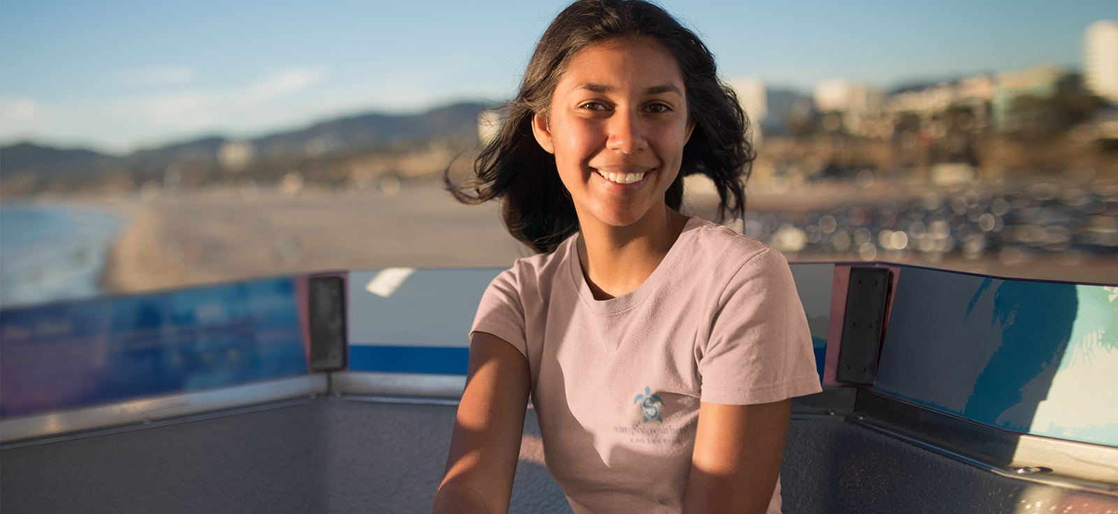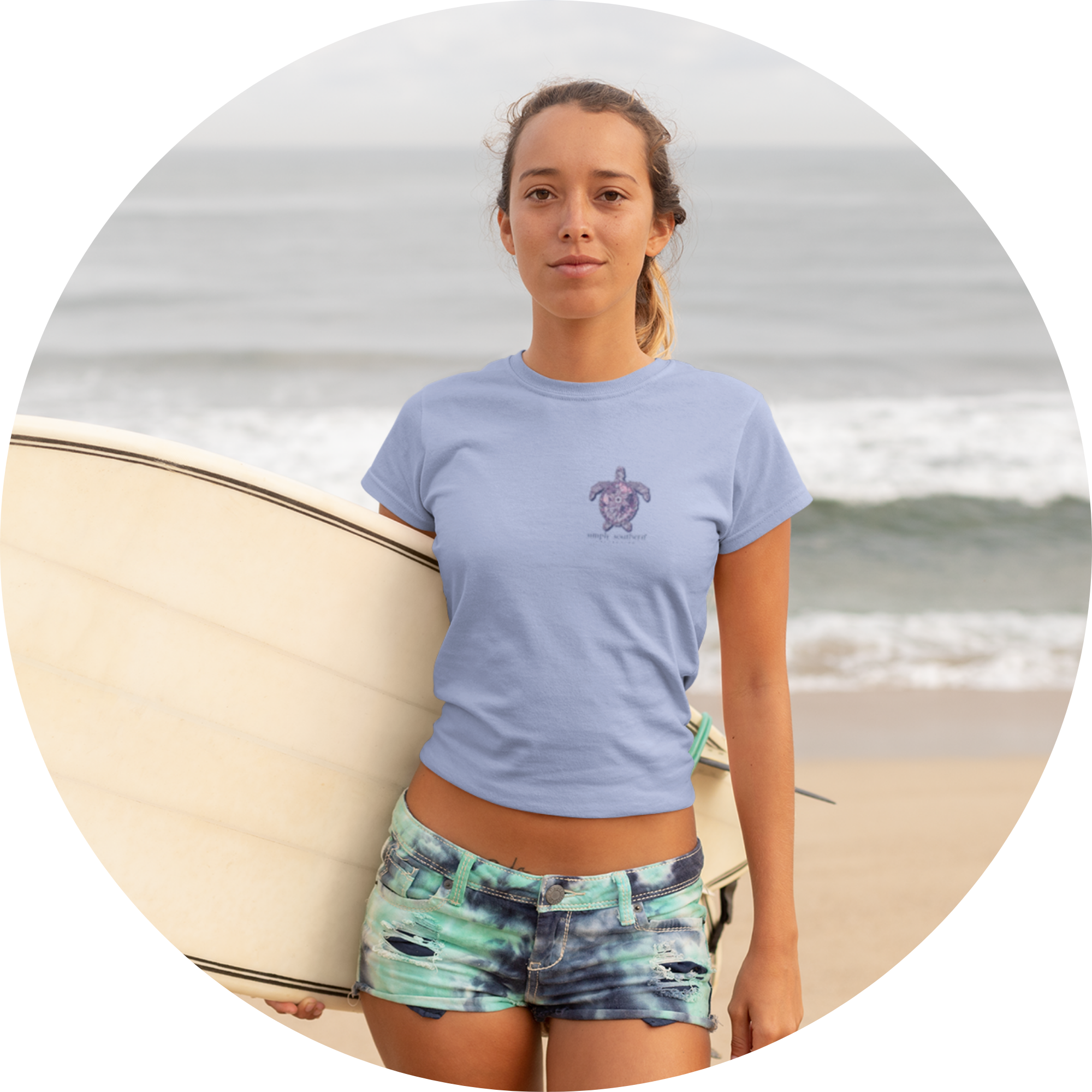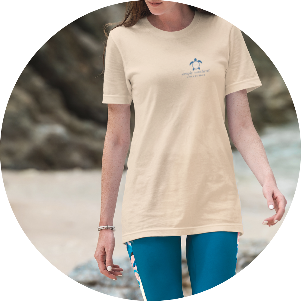 Sun yellow short sleeve shirt with a sea turtle silhouette filled with a rose pattern and topped with a pink bow. Simply Southern logo below and on left chest.