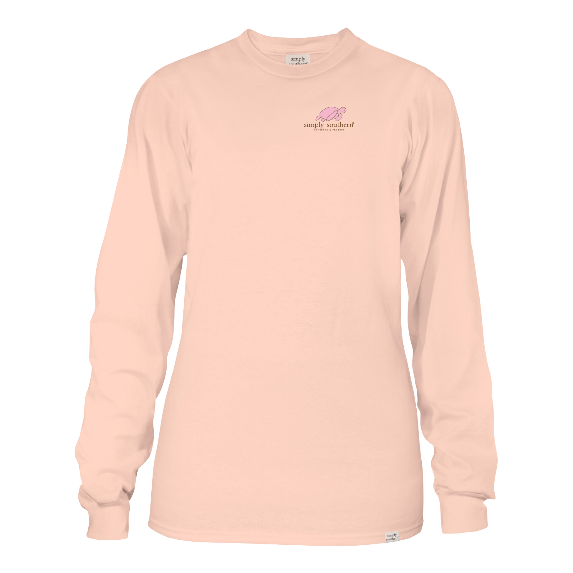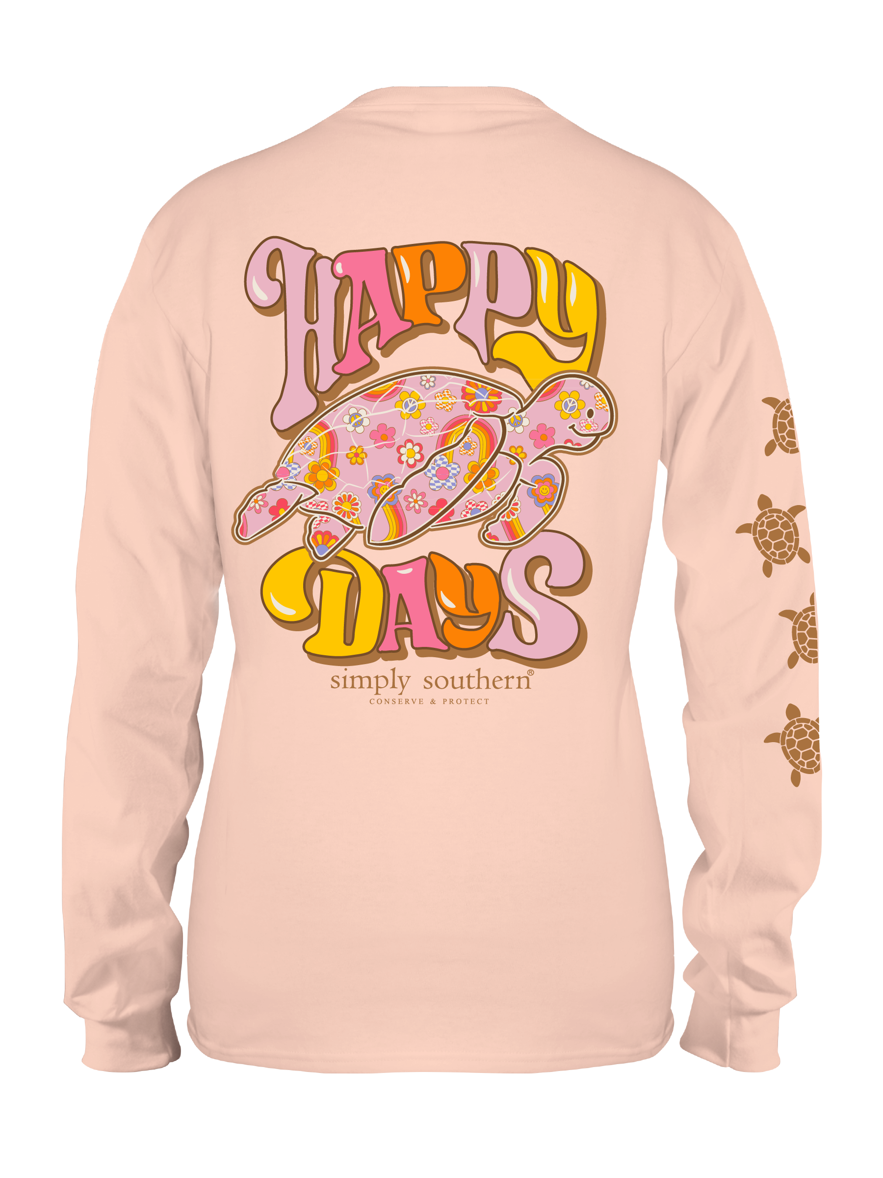 Creme long sleeve shirt with the phrase 'Happy Days' and a sea turtle filled in with groovy flowers and rainbows. Simply Southern logo below and on left chest. Sea turtles along right sleeve. Pre-shrunk and ring-spun 100% cotton. Unisex sizing. Turtle tracker.