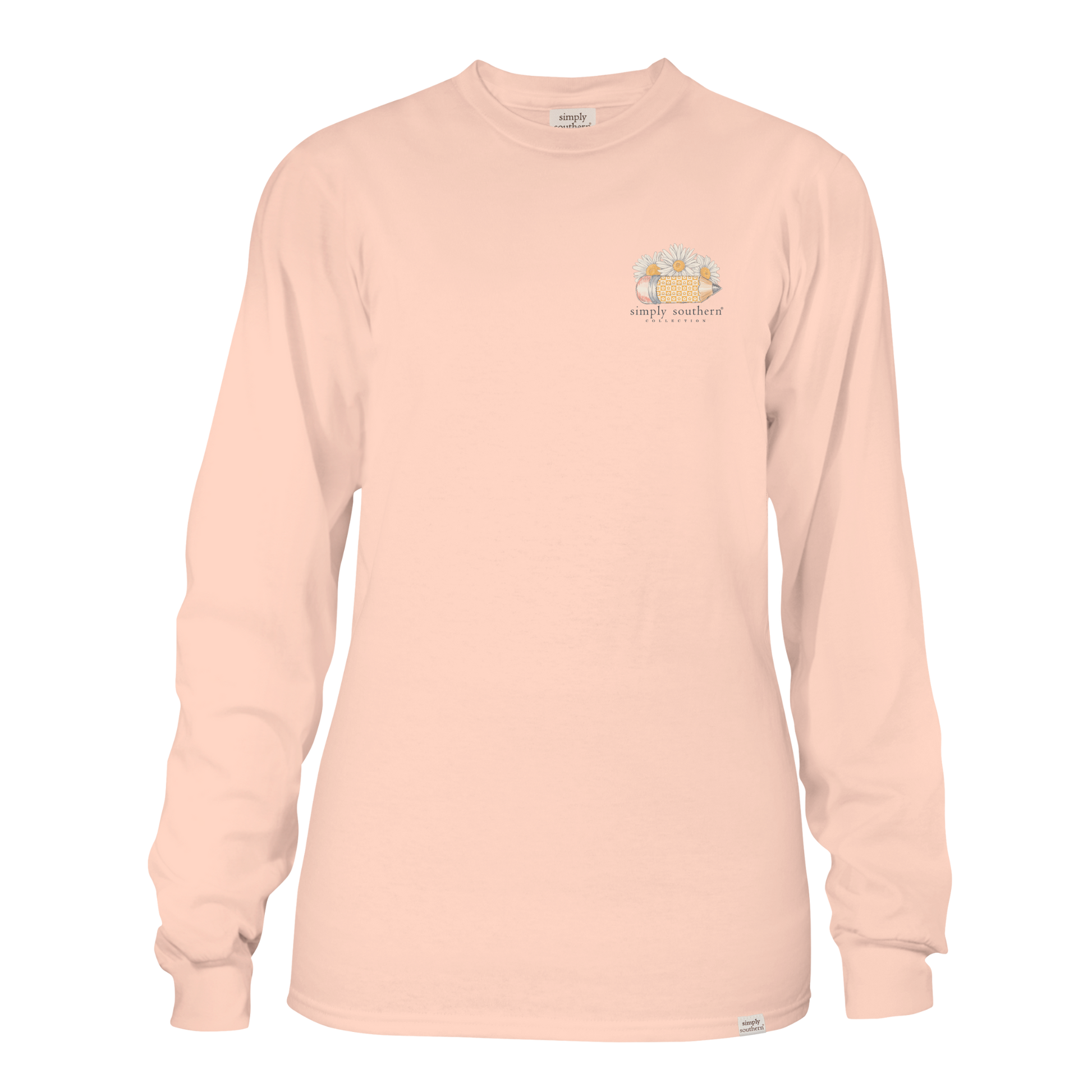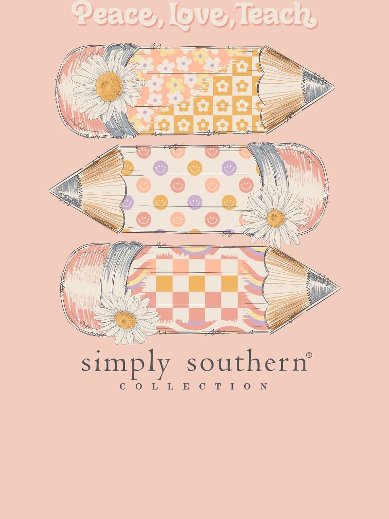 This Simply Southern tee features a graphic with 3 decorative pencils and the phrase "Peace, Love, Teach" above and along the right sleeve. Simply Southern logo is below the graphic and on the front left chest.
