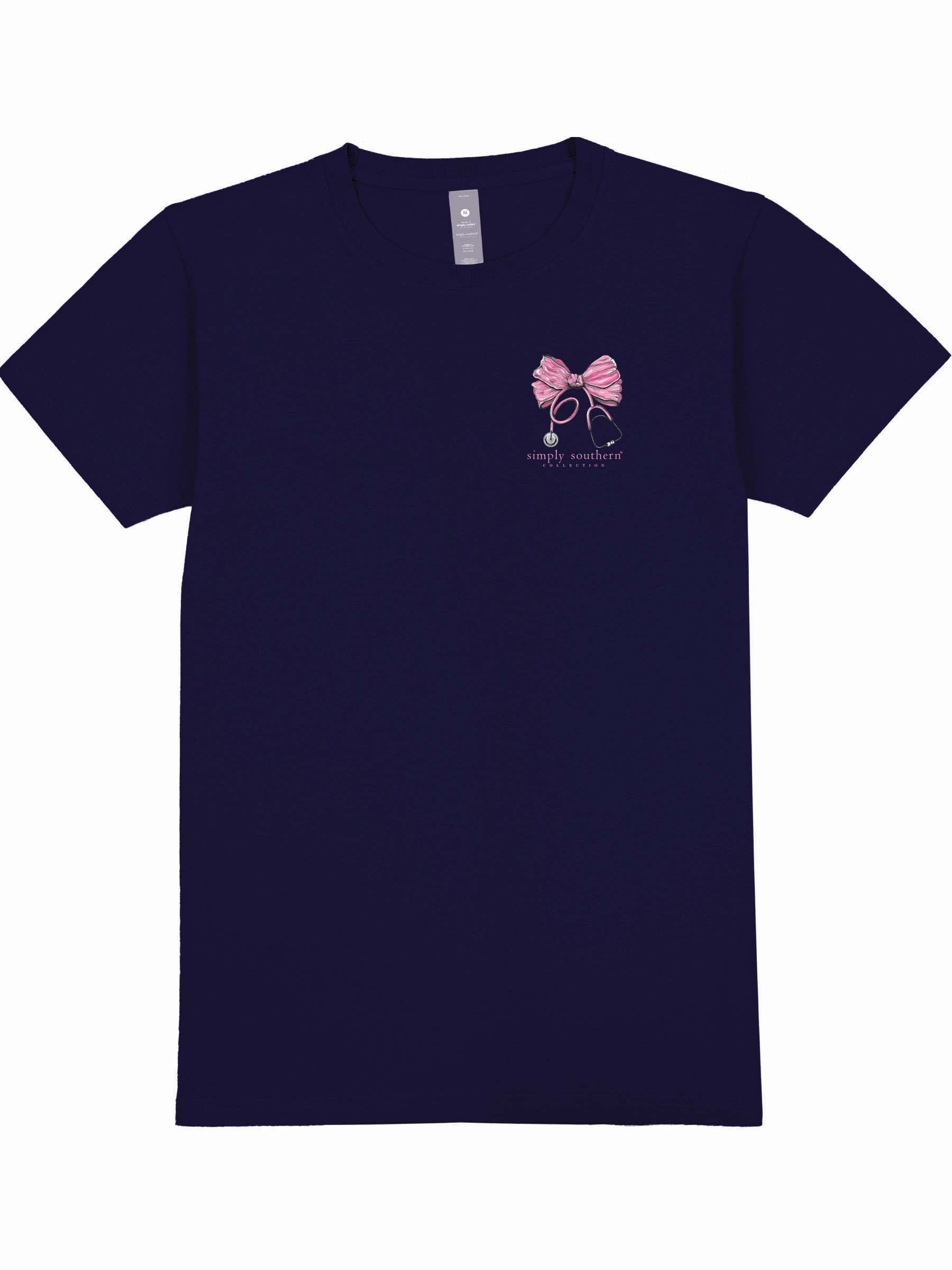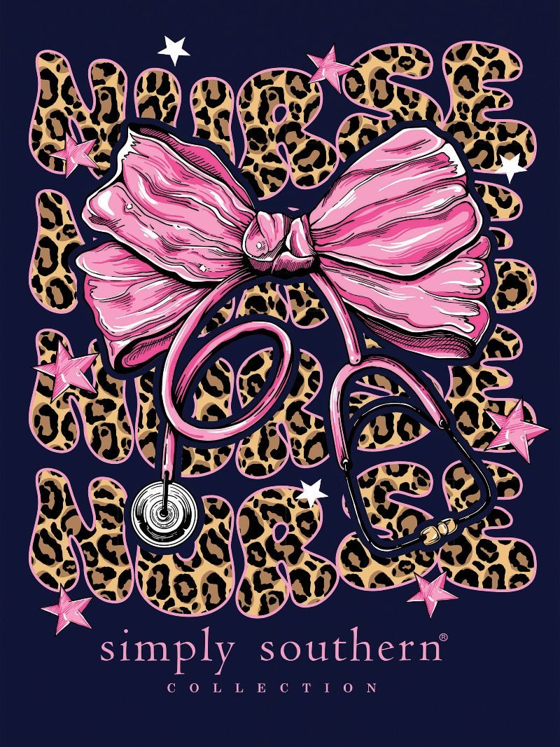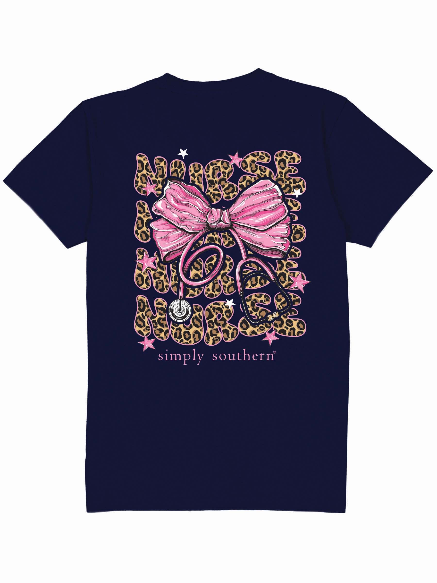 Navy blue short sleeve shirt with the word 'Nurse' in cheetah print repeating as a backdrop to a pink bow tied to a stethoscope. Simply Southern logo below. Similar design on left chest. 100% cotton. Unisex sizing.
